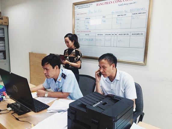 Nhân viên tổ thủ tục, đại lý đang thực hiện dịch vụ hải quan tại Chi cục hải quan Cảng Cái Lân.